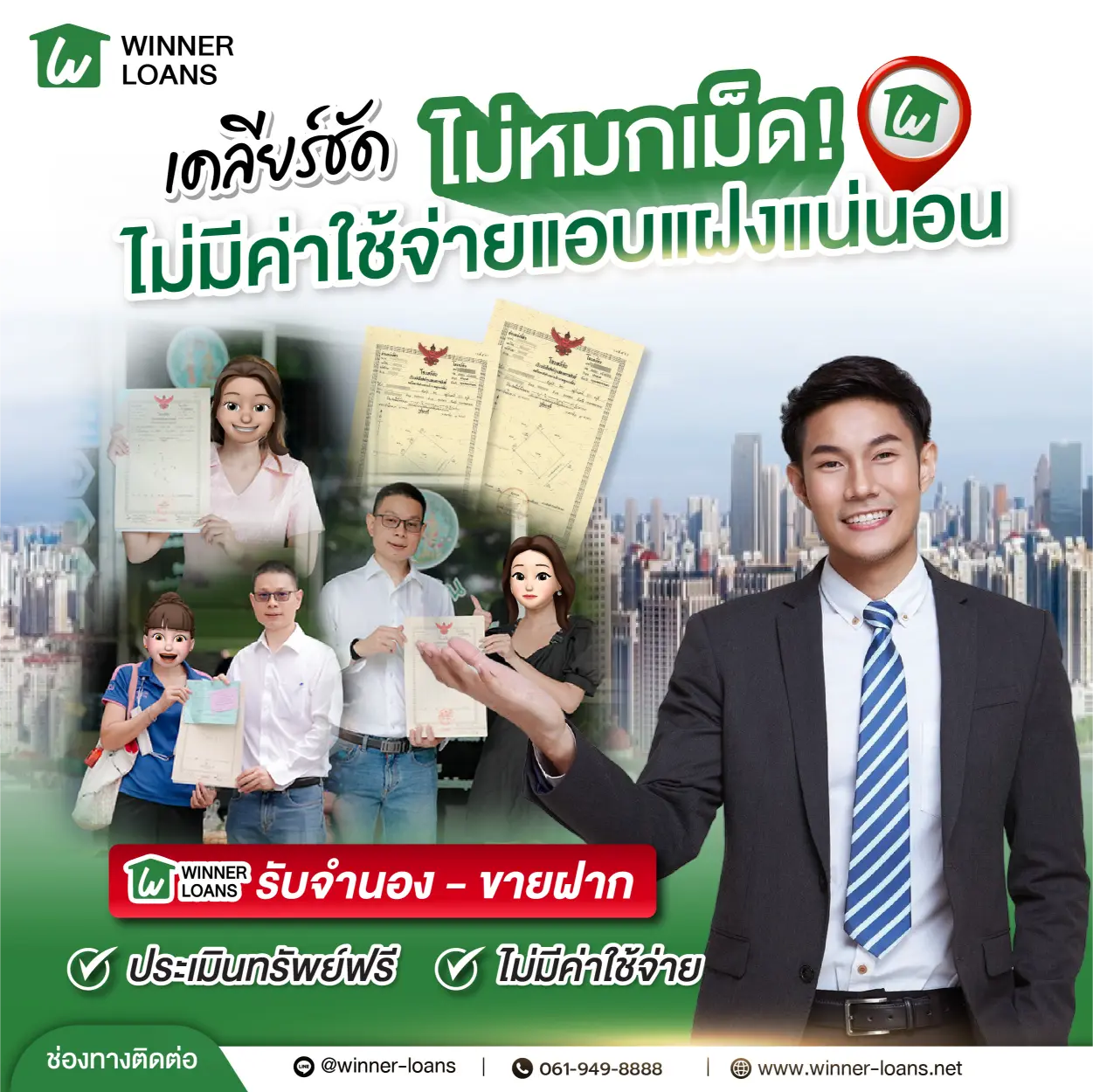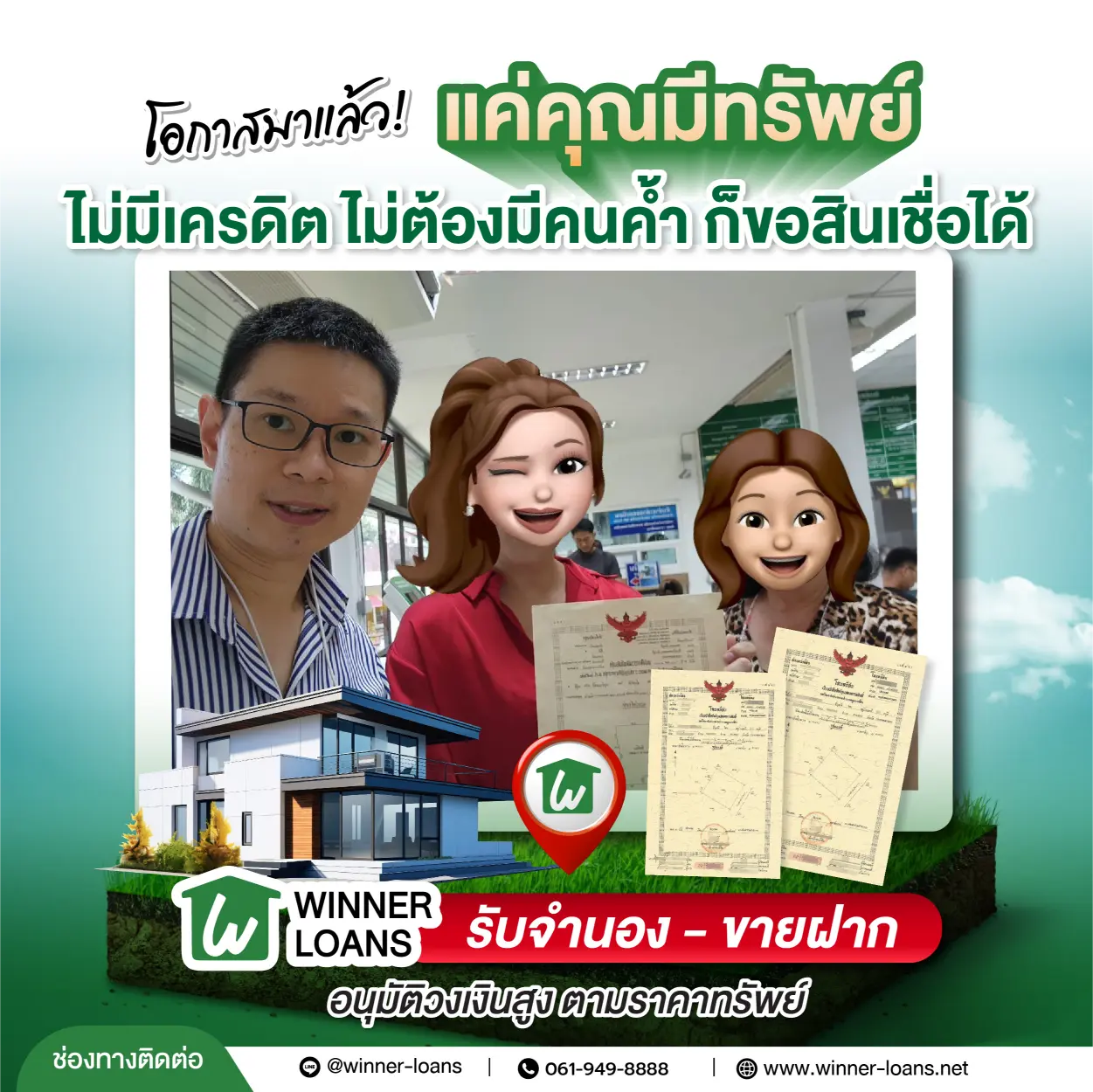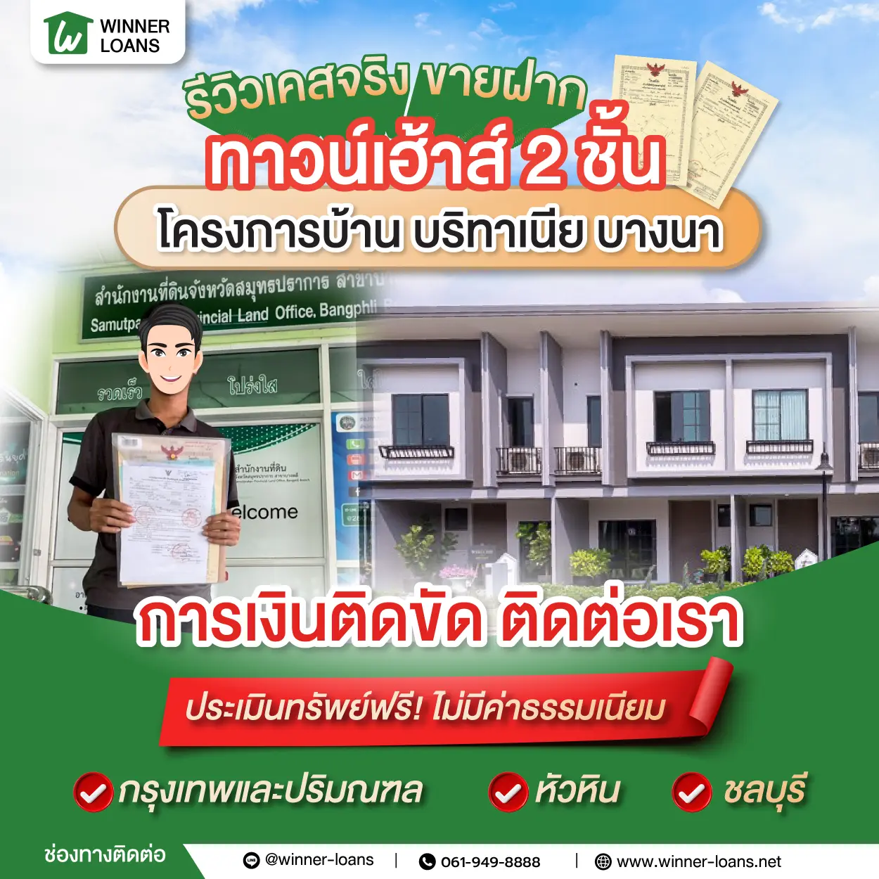 061-949-8888 หรือ Line@winner-loans เพื่อคุยรายละเอียดเบื้องต้น หรือ ส่งรายละเอียดทรัพย์ผ่านช่องทาง สมัครจำนอง-ขายฝากออนไลน์